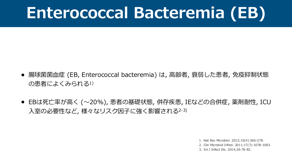 • 腸球菌菌 症 (EB, Enterococcal bacteremia) は, の患者によくみられる1) • EBは死亡率が く (〜20%), 患者の基礎状態, 併存疾患, IEなどの合併症, 薬剤耐性, ICU 室の必要性など, 様々なリスク因 に強く影響される2-3) 齢者, 衰弱した患者, 免疫抑制状態 高 子 高 1. Nat Rev Microbiol. 2012;10(4):266-278. 2. Clin Microbiol Infect. 2011;17(7):1078-1083. 3. Int J Infect Dis. 2014;26:76-82. 血 入 Enterococcal Bacteremia (EB) #19.