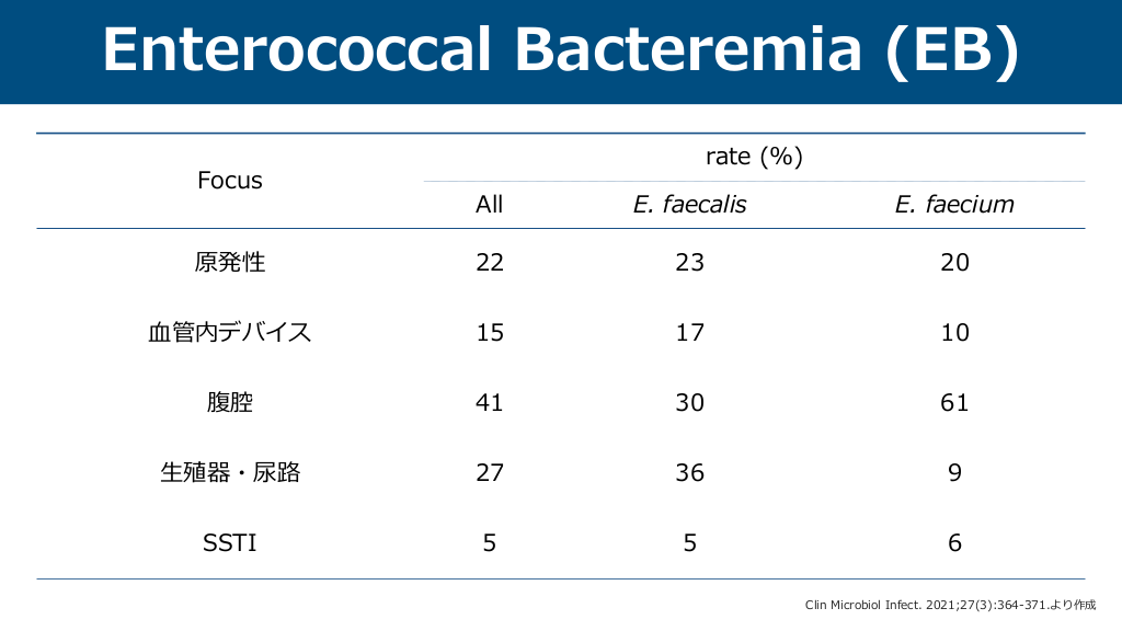生 血 Enterococcal Bacteremia (EB) Focus 原発性 管内デバイス 腹腔 殖器・尿路 SSTI rate (%) All E. faecalis E. faecium 22 23 20 15 17 10 41 30 61 27 36 9 5 5 6 Clin Microbiol Infect. 2021;27(3):364-371.より作成 腸球菌感染症のワークアップと治療戦略 #21.