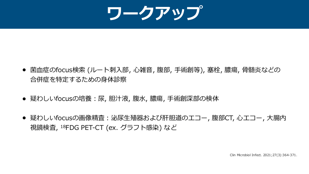 ワークアップ • 菌 症のfocus検索 (ルート刺 部, 合併症を特定するための 体診察 • 疑わしいfocusの培養:尿, 胆汁液, 腹 • 疑わしいfocusの画像精査:泌尿 殖器および肝胆道のエコー, 腹部CT, 視鏡検査, 18FDG PET-CT (ex. グラフト感染) など 雑 , 腹部, , 膿瘍, 術創等), 塞栓, 膿瘍, 髄炎などの 術創深部の検体 エコー, 腸内 大 骨 心 手 手 音 水 心 生 入 身 血 Clin Microbiol Infect. 2021;27(3):364-371. #23.