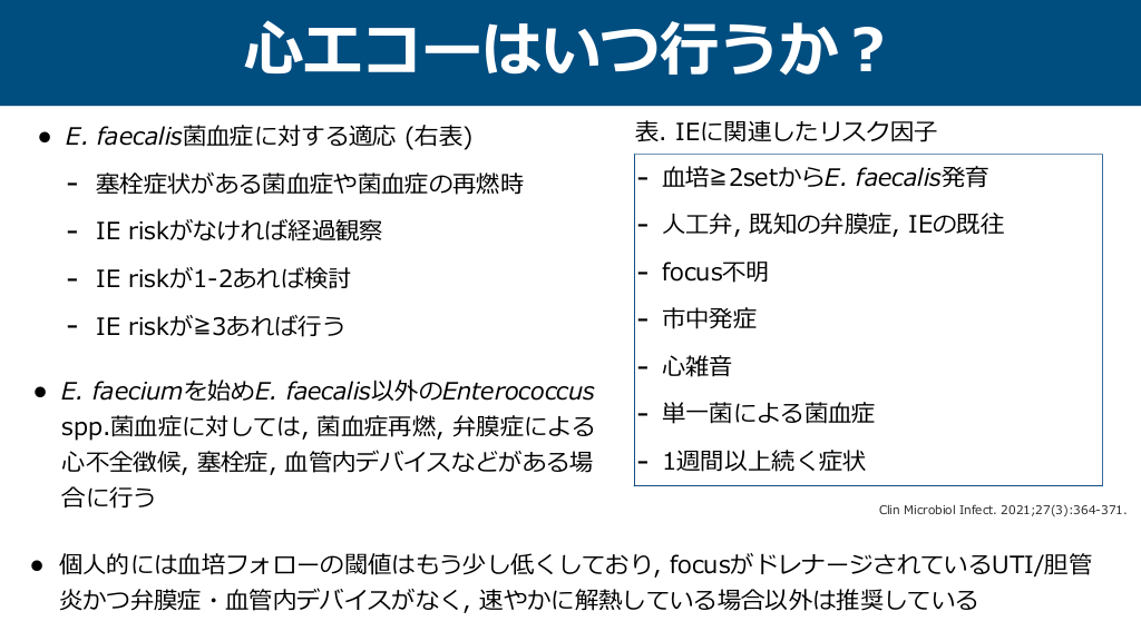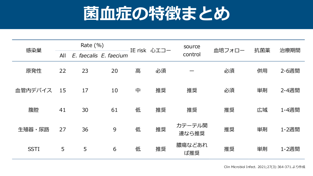 感染巣 原発性 管内デバイス 腹腔 殖器・尿路 SSTI 症の特徴まとめ Rate (%) All E. faecalis E. faecium 22 23 20 15 17 10 41 30 61 27 5 36 5 9 6 IE risk エコー source control 培フォロー 抗菌薬 治療期間 必須 ー 必須 併 2-6週間 中 推奨 推奨 必須 単剤 2-4週間 低 推奨 推奨 推奨 広域 1-4週間 推奨 カテーテル関 連なら推奨 推奨 単剤 1-2週間 推奨 膿瘍などあれ ば推奨 推奨 単剤 1-2週間 低 低 血 Clin Microbiol Infect. 2021;27(3):364-371.より作成 用 高 血 心 生 血 菌 #61.