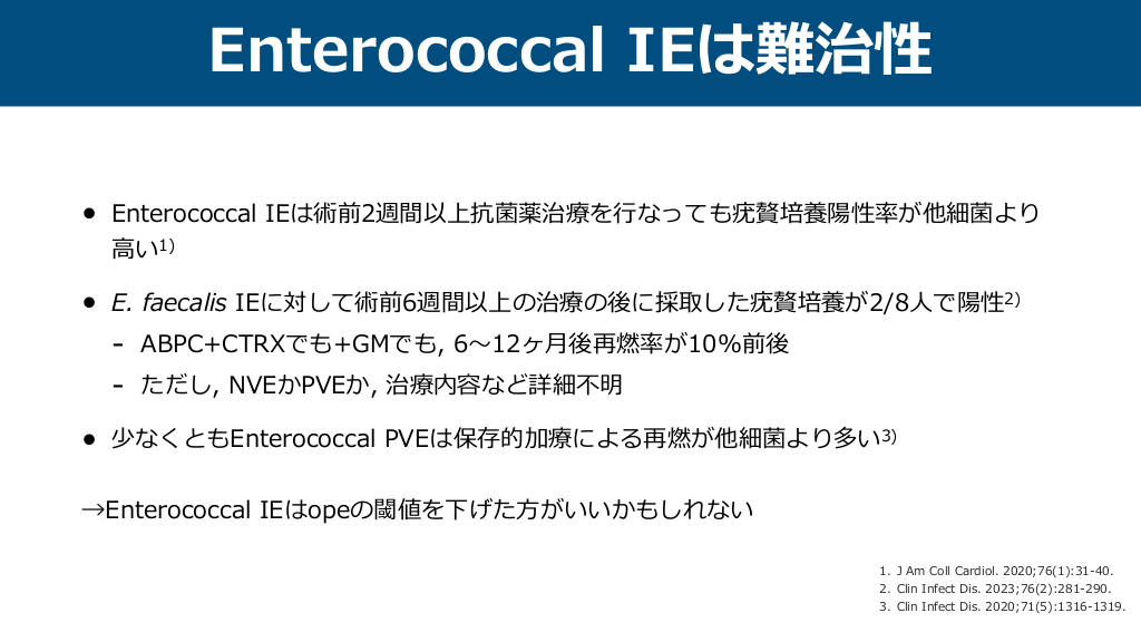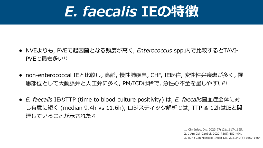 E. faecalis IEの特徴 • NVEよりも, PVEで起因菌となる頻度が PVEで最も多い1) • non-enterococcal IEと 較し, 齢, 慢性肺疾患, CHF, IE既往, 変性性弁疾患が多く, 罹 患部位として 動脈弁と 弁に多く, PM/ICDは稀で, 急性 不全を呈しやすい2) • E. faecalis IEのTTP (time to blood culture positivity) は, E. faecalis菌 症全体に対 し有意に短く (median 9.4h vs 11.6h), ロジスティック解析では, TTP ≦ 12hはIEと関 連していることが された3) く, Enterococcus spp.内で 較するとTAVI- 1. Clin Infect Dis. 2023;77(12):1617-1625. 血 比 心 高 高 工 人 比 示 大 2. J Am Coll Cardiol. 2020;75(5):482-494. 3. Eur J Clin Microbiol Infect Dis. 2021;40(8):1657-1664. #26.