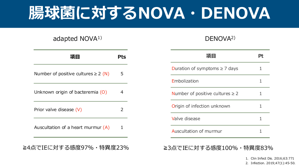 腸球菌に対するNOVA・DENOVA adapted NOVA1) 項 Number of positive cultures ≥ 2 (N) Unknown origin of bacteremia (O) Prior valve disease (V) Auscultation of a heart murmur (A) DENOVA2) 項 Pts 5 4 2 1 ≧4点でIEに対する感度97%・特異度23% Pt Duration of symptoms ≥ 7 days 1 Embolization 1 Number of positive cultures ≥ 2 1 Origin of infection unknown 1 Valve disease 1 Auscultation of murmur 1 ≧3点でIEに対する感度100%・特異度83% 目 目 1. Clin Infect Dis. 2016;63:771 2. Infection. 2019;47(1):45-50. #27.