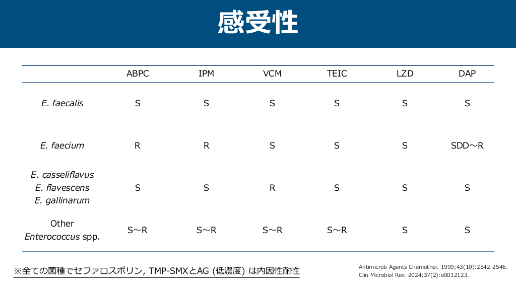 感受性 ABPC IPM VCM TEIC LZD DAP E. faecalis S S S S S S E. faecium R R S S S SDD〜R E. casseli avus E. avescens E. gallinarum S S R S S S Other Enterococcus spp. S〜R S〜R S〜R S〜R S S fl fl ※全ての菌種でセファロスポリン, TMP-SMXとAG (低濃度) は内因性耐性 Antimicrob Agents Chemother. 1999;43(10):2542-2546. Clin Microbiol Rev. 2024;37(2):e0012123. #29.