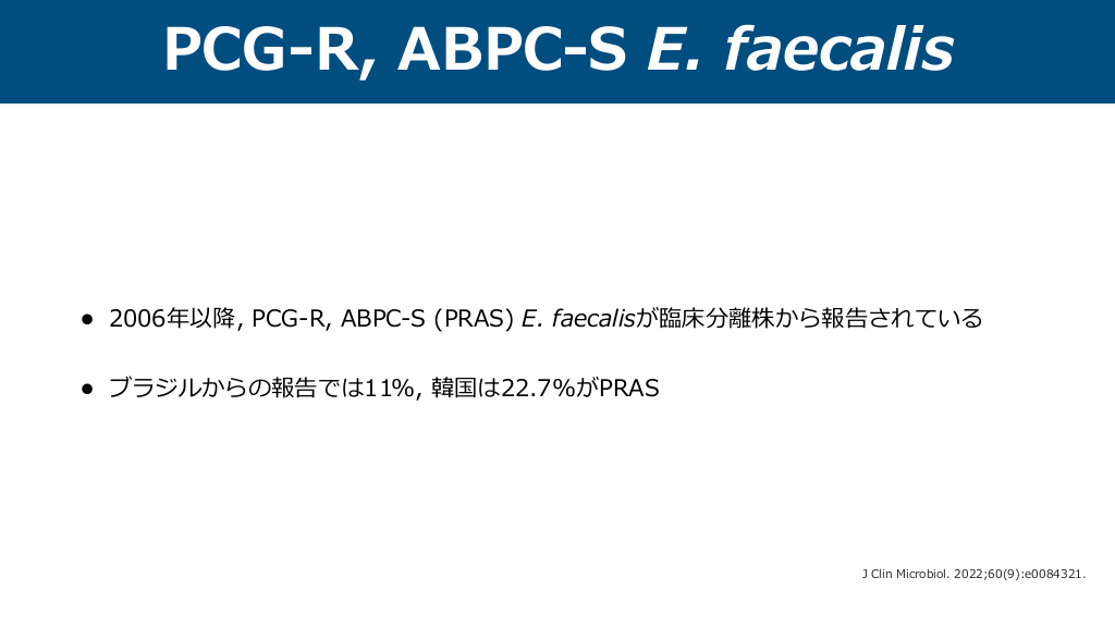 PCG-R, ABPC-S E. faecalis • 2006年以降, PCG-R, ABPC-S (PRAS) E. faecalisが臨床分離株から報告されている • ブラジルからの報告では11%, 韓国は22.7%がPRAS J Clin Microbiol. 2022;60(9):e0084321. #32.