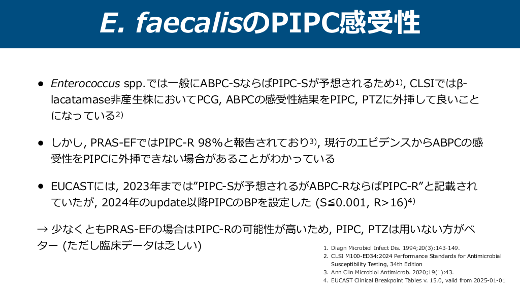 E. faecalisのPIPC感受性 • Enterococcus spp.では 般にABPC-SならばPIPC-Sが予想されるため1), CLSIではβlacatamase 産 株においてPCG, ABPCの感受性結果をPIPC, PTZに外挿して良いこと になっている2) • しかし, PRAS-EFではPIPC-R 98%と報告されており3), 現 のエビデンスからABPCの感 受性をPIPCに外挿できない場合があることがわかっている • EUCASTには, 2023年までは”PIPC-Sが予想されるがABPC-RならばPIPC-R”と記載され ていたが, 2024年のupdate以降PIPCのBPを設定した (S≦0.001, R>16)4) いため, PIPC, PTZは いない がベ 方 1. Diagn Microbiol Infect Dis. 1994;20(3):143-149. 2. CLSI M100-ED34:2024 Performance Standards for Antimicrobial Susceptibility Testing, 34th Edition 3. Ann Clin Microbiol Antimicrob. 2020;19(1):43. 4. EUCAST Clinical Breakpoint Tables v. 15.0, valid from 2025-01-01 用 行 高 一 生 非 → 少なくともPRAS-EFの場合はPIPC-Rの可能性が ター (ただし臨床データは乏しい) #34.