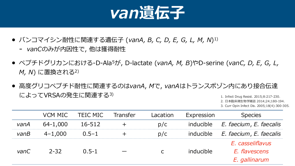 • バンコマイシン耐性に関連する遺伝 (vanA, B, C, D, E, G, L, M, N)1) - vanCのみが内因性で, 他は獲得耐性 • ペプチドグリカンにおける-D-Ala5が, D-lactate (vanA, M, B)やD-serine (vanC, D, E, G, L, M, N) に置換される2) • 度グリコペプチド耐性に関連するのはvanA, Mで, vanAはトランスポゾン内にあり接合伝達 によってVRSAの発 に関連する3) 1. Infect Drug Resist. 2015;8:217-230. 2. 本臨床微 物学雑誌 2014;24;180-194. 3. Curr Opin Infect Dis. 2005;18(4):300-305. VCM MIC TEIC MIC Transfer Lacation Expression Species vanA 64-1,000 16-512 + p/c inducible E. faecium, E. faecalis vanB 4–1,000 0.5–1 + p/c inducible E. faecium, E. faecalis inducible E. casseli avus E. avescens E. gallinarum 0.5-1 ー 子 子 2-32 生 fl 生 vanC fl 高 日 van遺伝 c #36.