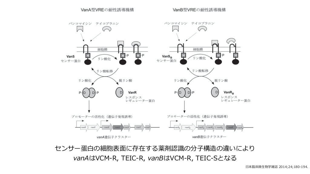 の細胞表 に存在する薬剤認識の分 構造の違いにより vanAはVCM-R, TEIC-R, vanBはVCM-R, TEIC-Sとなる 子 面 白 本臨床微 生 日 センサー蛋 物学雑誌 2014;24;180-194. 腸球菌感染症におけるDAP耐性と治療戦略 #37.