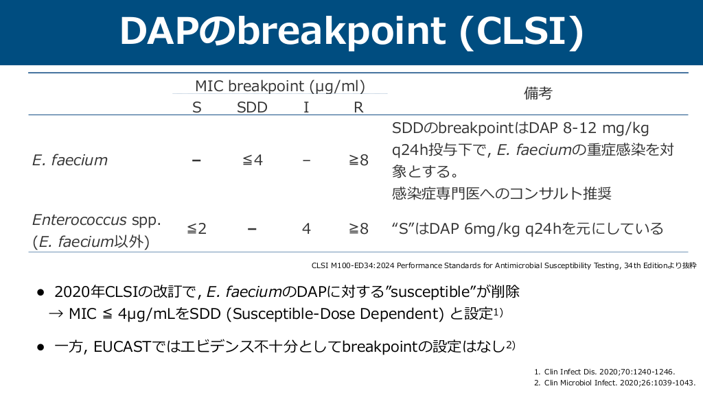 MIC breakpoint (μg/ml) S SDD I R E. faecium Enterococcus spp. (E. faecium以外) 備考 – ≦4 – ≧8 SDDのbreakpointはDAP 8-12 mg/kg q24h投与下で, E. faeciumの重症感染を対 象とする。 感染症専 医へのコンサルト推奨 ≦2 – 4 ≧8 “S”はDAP 6mg/kg q24hを元にしている CLSI M100-ED34:2024 Performance Standards for Antimicrobial Susceptibility Testing, 34th Editionより抜粋 • 2020年CLSIの改訂で, E. faeciumのDAPに対する”susceptible”が削除 → MIC ≦ 4μg/mLをSDD (Susceptible-Dose Dependent) と設定1) • , EUCASTではエビデンス不 分としてbreakpointの設定はなし2) 十 門 1. Clin Infect Dis. 2020;70:1240-1246. 2. Clin Microbiol Infect. 2020;26:1039-1043. 方 一 DAPのbreakpoint (CLSI) #39.