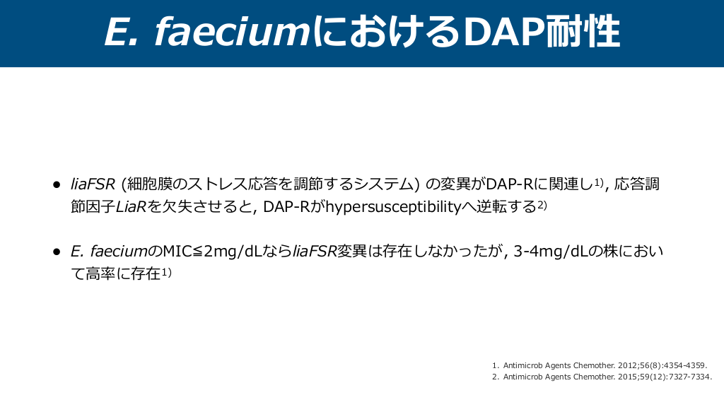 E. faeciumにおけるDAP耐性 • liaFSR (細胞膜のストレス応答を調節するシステム) の変異がDAP-Rに関連し1), 応答調 節因 LiaRを 失させると, DAP-Rがhypersusceptibilityへ逆転する2) • E. faeciumのMIC≦2mg/dLならliaFSR変異は存在しなかったが, 3-4mg/dLの株におい て 率に存在1) 1. Antimicrob Agents Chemother. 2012;56(8):4354-4359. 欠 子 高 2. Antimicrob Agents Chemother. 2015;59(12):7327-7334. #40.