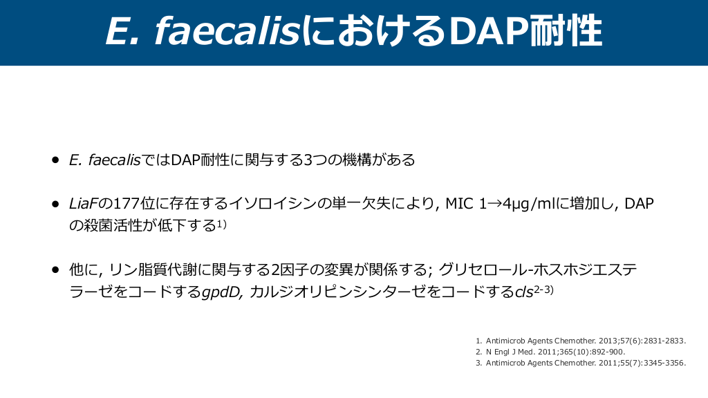 E. faecalisにおけるDAP耐性 • E. faecalisではDAP耐性に関与する3つの機構がある • LiaFの177位に存在するイソロイシンの単 の殺菌活性が低下する1) • 他に, リン脂質代謝に関与する2因 の変異が関係する; グリセロール-ホスホジエステ ラーゼをコードするgpdD, カルジオリピンシンターゼをコードするcls2-3) 失により, MIC 1→4μg/mlに増加し, DAP 欠 一 子 1. Antimicrob Agents Chemother. 2013;57(6):2831-2833. 2. N Engl J Med. 2011;365(10):892-900. 3. Antimicrob Agents Chemother. 2011;55(7):3345-3356. #42.