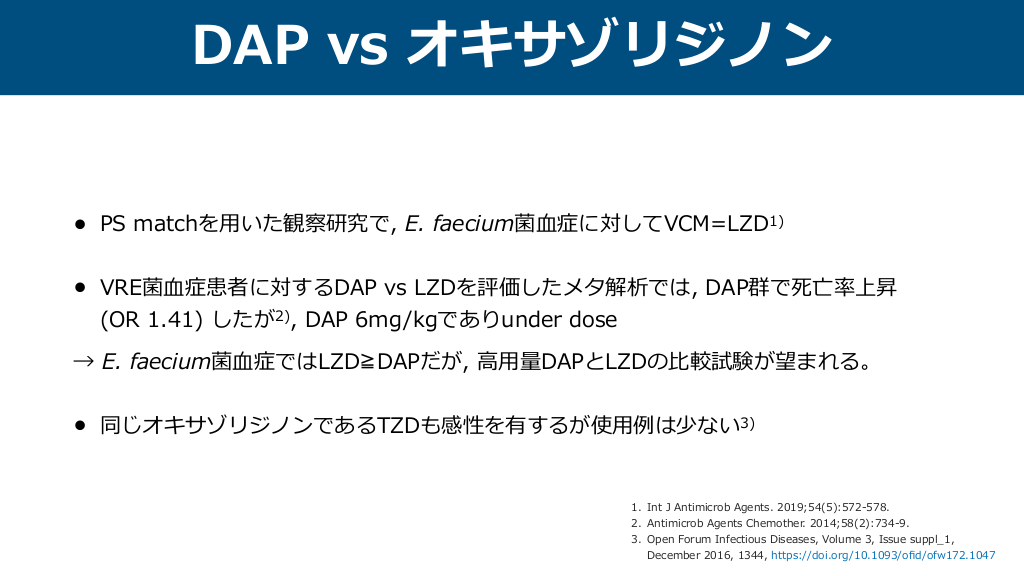 DAPのポジション • DAP MIC 2-4 mg/LのE. faeciumに対し, DAP 10-12mg/kgならfAUC/MIC≧27.4を達成可能1) • VRE患者の予後を評価した後 視的研究では, DAP 8-10mg/kgが6mg/kgよりも予後・微 物学的治療成 2), MIC 4mg/LのE. faecium菌 功率が かった 症をDAPで治療すると再燃が多く, DAP ≧8mg/kg でも転機に関与しない可能性がある3) • DAP 10-12mg/kgでも, E. faecalis (MIC 4mg/L) およびE. faecium (MIC 4-8mg/L) による感染症を治 療することはPK-PDデータからは難しい可能性がある4) • VREによる感染性 内膜炎のマウスモデル研究では, DAP 12mg/kgはMIC 0.5 mg/Lと8 mg/Lの両 クリアランスを めたが, MIC 8 mg/Lでは疣贅を無菌化できなかった5) 症に対するDAPは12mg/kgが望ましく, IEなどの侵襲性感染症に対しては慎重に使 する 用 方 Clin Infect Dis. 2019;68:1650-1657. Clin Infect Dis. 2017;64:605-613. Clin Infect Dis. 2016;62(12):1514-1520. Clin Microbiol Infect. 2020;26(8):1039-1043. Microbiol Spectr. 2022;10(5):e0255122. 生 血 1. 2. 3. 4. 5. 方 方 心 血 一 高 高 → E. faecium菌 べきである で 腸球菌に対するフルオロキノロンとアミノグリコシドの使用 #43. DAP vs オキサゾリジノン • PS matchを • VRE菌 症患者に対するDAP vs LZDを評価したメタ解析では, DAP群で死亡率上昇 (OR 1.41) したが2), DAP 6mg/kgでありunder dose → E. faecium菌 • いた観察研究で, E. faecium菌 症ではLZD≧DAPだが, 症に対してVCM=LZD1) 量DAPとLZDの 較試験が望まれる。 同じオキサゾリジノンであるTZDも感性を有するが使 例は少ない3) 比 用 血 用 高 fi 血 用 血 1. Int J Antimicrob Agents. 2019;54(5):572-578. 2. Antimicrob Agents Chemother. 2014;58(2):734-9. 3. Open Forum Infectious Diseases, Volume 3, Issue suppl_1, December 2016, 1344, https://doi.org/10.1093/o d/ofw172.1047 #44.