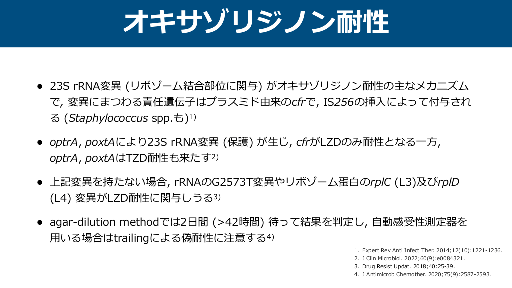 • 23S rRNA変異 (リボゾーム結合部位に関与) がオキサゾリジノン耐性の主なメカニズム で, 変異にまつわる責任遺伝 はプラスミド由来のcfrで, IS256の挿 によって付与され る (Staphylococcus spp.も)1) • optrA, poxtAにより23S rRNA変異 (保護) が optrA, poxtAはTZD耐性も来たす2) • 上記変異を持たない場合, rRNAのG2573T変異やリボゾーム蛋 のrplC (L3)及びrplD (L4) 変異がLZD耐性に関与しうる3) • agar-dilution methodでは2 間 (>42時間) 待って結果を判定し, いる場合はtrailingによる偽耐性に注意する4) じ, cfrがLZDのみ耐性となる , 動感受性測定器を 方 Expert Rev Anti Infect Ther. 2014;12(10):1221-1236. J Clin Microbiol. 2022;60(9):e0084321. Drug Resist Updat. 2018;40:25-39. J Antimicrob Chemother. 2020;75(9):2587-2593. 一 入 自 白 生 日 1. 2. 3. 4. 子 用 オキサゾリジノン耐性 #45.
