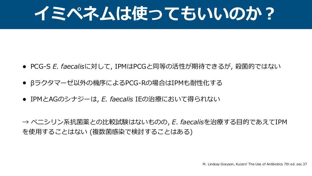 イミペネムは使ってもいいのか? • PCG-S E. faecalisに対して, IPMはPCGと同等の活性が期待できるが, 殺菌的ではない • βラクタマーゼ以外の機序によるPCG-Rの場合はIPMも耐性化する • IPMとAGのシナジーは, E. faecalis IEの治療において得られない → ペニシリン系抗菌薬との 較試験はないものの, E. faecalisを治療する を使 することはない (複数菌感染で検討することはある) 的であえてIPM 目 比 用 M. Lindsay Grayson, Kucers' The Use of Antibiotics 7th ed. sec.37 #46.