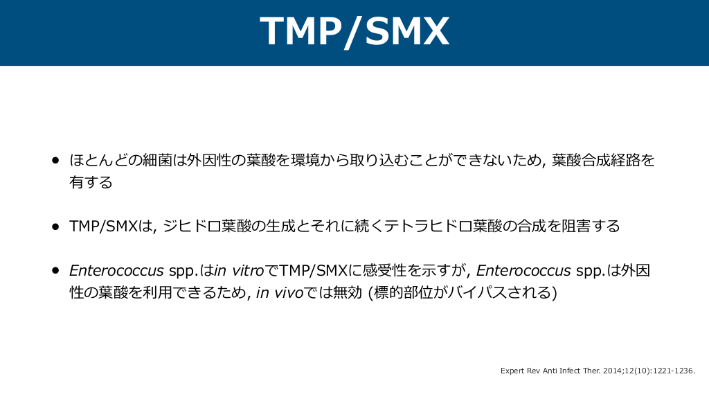 TMP/SMX • ほとんどの細菌は外因性の葉酸を環境から取り込むことができないため, 葉酸合成経路を 有する • TMP/SMXは, ジヒドロ葉酸の • Enterococcus spp.はin vitroでTMP/SMXに感受性を すが, Enterococcus spp.は外因 性の葉酸を利 できるため, in vivoでは無効 (標的部位がバイパスされる) 成とそれに続くテトラヒドロ葉酸の合成を阻害する 示 生 用 Expert Rev Anti Infect Ther. 2014;12(10):1221-1236. #48.
