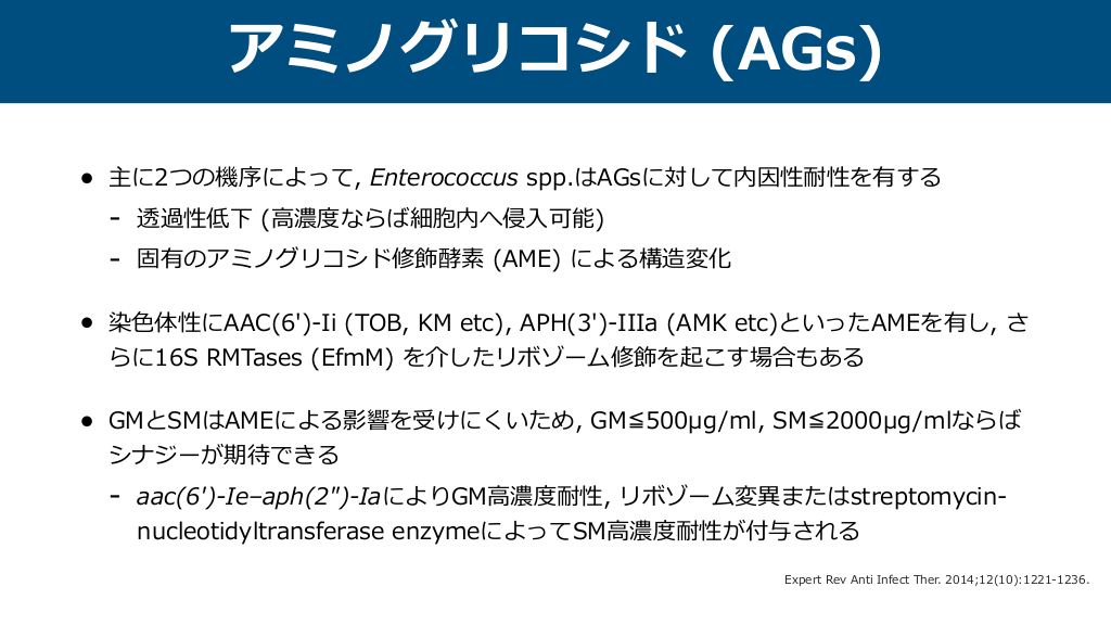 アミノグリコシド (AGs) lEnterococci display intrinsic tolerance (manifested by the lack of bactericidal activity) to the aminoglycosides. This phenomenon seems to • 主に2つの機序によって, Enterococcus spp.はAGsに対して内因性耐性を有する - 透過性低下 ( 濃度ならば細胞内へ侵 可能) 固有のアミノグリコシド修飾酵素 (AME) による構造変化 • 染 体性にAAC(6′)-Ii (TOB, KM etc), APH(3′)-IIIa (AMK etc)といったAMEを有し, さ らに16S RMTases (EfmM) を介したリボゾーム修飾を起こす場合もある • GMとSMはAMEによる影響を受けにくいため, GM≦500μg/ml, SM≦2000μg/mlならば シナジーが期待できる - aac(6′)-Ie–aph(2″)-IaによりGM 濃度耐性, リボゾーム変異またはstreptomycinnucleotidyltransferase enzymeによってSM 濃度耐性が付与される 高 入 高 高 色 Expert Rev Anti Infect Ther. 2014;12(10):1221-1236. 感染性内膜炎における腸球菌の治療方針 #49.