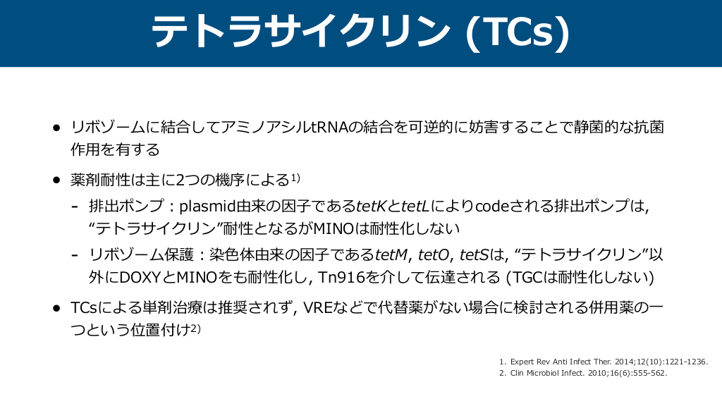 テトラサイクリン (TCs) • リボゾームに結合してアミノアシルtRNAの結合を可逆的に妨害することで静菌的な抗菌 作 を有する • 薬剤耐性は主に2つの機序による1) • - 排出ポンプ:plasmid由来の因 であるtetKとtetLによりcodeされる排出ポンプは, “テトラサイクリン”耐性となるがMINOは耐性化しない - リボゾーム保護:染 体由来の因 であるtetM, tetO, tetSは, “テトラサイクリン”以 外にDOXYとMINOをも耐性化し, Tn916を介して伝達される (TGCは耐性化しない) TCsによる単剤治療は推奨されず, VREなどで代替薬がない場合に検討される併 つという位置付け2) 薬の 一 用 子 子 色 用 1. Expert Rev Anti Infect Ther. 2014;12(10):1221-1236. 2. Clin Microbiol Infect. 2010;16(6):555-562. #50.