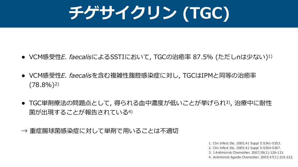 チゲサイクリン (TGC) • VCM感受性E. faecalisによるSSTIにおいて, TGCの治癒率 87.5% (ただしnは少ない)1) • VCM感受性E. faecalisを含む複雑性腹腔感染症に対し, TGCはIPMと同等の治癒率 (78.8%)2) • TGC単剤療法の問題点として, 得られる 菌が出現することが報告されている4) → 重症腸球菌感染症に対して単剤で 中濃度が低いことが挙げられ3), 治療中に耐性 いることは不適切 1. Clin Infect Dis. 2005;41 Suppl 5:S341-S353. 2. Clin Infect Dis. 2005;41 Suppl 5:S354-S367. 3. J Antimicrob Chemother. 2007;59(1):128-131. 血 用 4. Antimicrob Agents Chemother. 2003;47(1):216-222. #51.