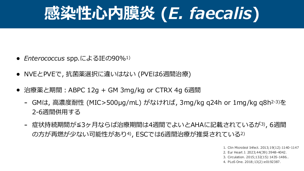 感染性 内膜炎 (E. faecalis) • Enterococcus spp.によるIEの90%1) • NVEとPVEで, 抗菌薬選択に違いはない (PVEは6週間治療) • 治療薬と期間:ABPC 12g + GM 3mg/kg or CTRX 4g 6週間 - GMは, 濃度耐性 (MIC>500μg/mL) がなければ, 3mg/kg q24h or 1mg/kg q8h2-3)を 2-6週間併 する - 症状持続期間が≦3ヶ ならば治療期間は4週間でよいとAHAに記載されているが3), 6週間 の が再燃が少ない可能性があり4), ESCでは6週間治療が推奨されている2) 月 心 用 高 方 1. 2. 3. 4. Clin Microbiol Infect. 2013;19(12):1140-1147 Eur Heart J. 2023;44(39):3948-4042. Circulation. 2015;132(15):1435-1486.. PLoS One. 2018;13(2):e0192387. #53.