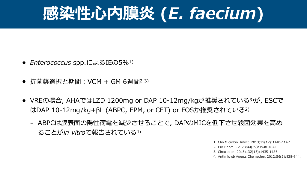 感染性 内膜炎 (E. faecium) • Enterococcus spp.によるIEの5%1) • 抗菌薬選択と期間:VCM + GM 6週間2-3) • VREの場合, AHAではLZD 1200mg or DAP 10-12mg/kgが推奨されている3)が, ESCで はDAP 10-12mg/kg+βL (ABPC, EPM, or CFT) or FOSが推奨されている2) - ABPCは膜表 の陽性荷電を減少させることで, DAPのMICを低下させ殺菌効果を ることがin vitroで報告されている4) Clin Microbiol Infect. 2013;19(12):1140-1147 Eur Heart J. 2023;44(39):3948-4042. Circulation. 2015;132(15):1435-1486. Antimicrob Agents Chemother. 2012;56(2):838-844. 高 心 面 1. 2. 3. 4. め #54.