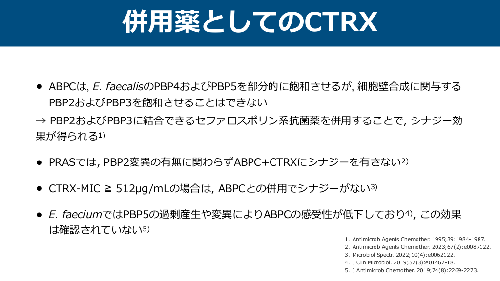 併 • 薬としてのCTRX ABPCは, E. faecalisのPBP4およびPBP5を部分的に飽和させるが, 細胞壁合成に関与する PBP2およびPBP3を飽和させることはできない → PBP2およびPBP3に結合できるセファロスポリン系抗菌薬を併 することで, シナジー効 果が得られる1) • PRASでは, PBP2変異の有無に関わらずABPC+CTRXにシナジーを有さない2) • CTRX-MIC ≧ 512μg/mLの場合は, ABPCとの併 • E. faeciumではPBP5の過剰産 や変異によりABPCの感受性が低下しており4), この効果 は確認されていない5) でシナジーがない3) 1. Antimicrob Agents Chemother. 1995;39:1984-1987. 2. Antimicrob Agents Chemother. 2023;67(2):e0087122. 用 用 生 用 3. Microbiol Spectr. 2022;10(4):e0062122. 4. J Clin Microbiol. 2019;57(3):e01467-18. 5. J Antimicrob Chemother. 2019;74(8):2269-2273. #55.
