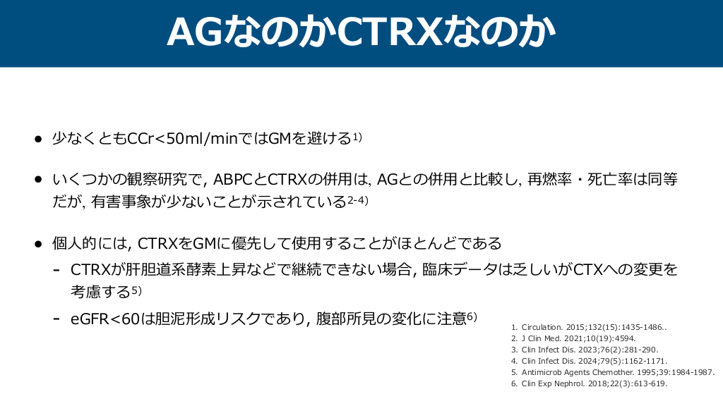 • 少なくともCCr<50ml/minではGMを避ける1) • いくつかの観察研究で, ABPCとCTRXの併 • 個 だが, 有害事象が少ないことが は, AGとの併 と 較し, 再燃率・死亡率は同等 されている2-4) 的には, CTRXをGMに優先して使 することがほとんどである 比 の変化に注意6) 用 見 - eGFR<60は胆泥形成リスクであり, 腹部所 用 CTRXが肝胆道系酵素上昇などで継続できない場合, 臨床データは乏しいがCTXへの変更を 考慮する5) 用 - 示 人 AGなのかCTRXなのか 1. 2. 3. 4. 5. 6. Circulation. 2015;132(15):1435-1486.. J Clin Med. 2021;10(19):4594. Clin Infect Dis. 2023;76(2):281-290. Clin Infect Dis. 2024;79(5):1162-1171. Antimicrob Agents Chemother. 1995;39:1984-1987. Clin Exp Nephrol. 2018;22(3):613-619. 腸球菌感染症の症例報告と治療経過 #56.