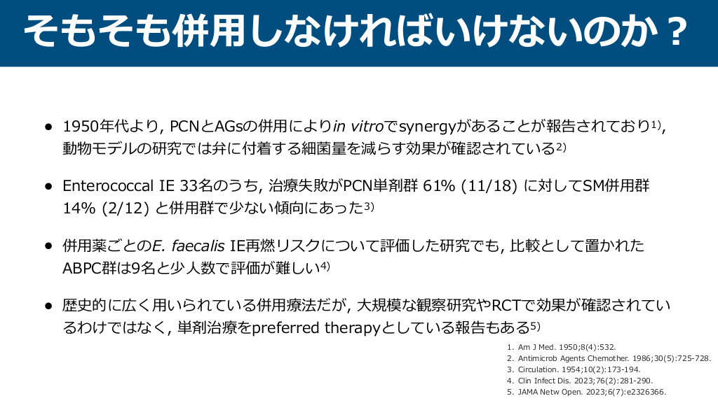 そもそも併 しなければいけないのか? • 1950年代より, PCNとAGsの併 によりin vitroでsynergyがあることが報告されており1), 動物モデルの研究では弁に付着する細菌量を減らす効果が確認されている2) • Enterococcal IE 33名のうち, 治療失敗がPCN単剤群 61% (11/18) に対してSM併 14% (2/12) と併 群で少ない傾向にあった3) • 併 薬ごとのE. faecalis IE再燃リスクについて評価した研究でも, ABPC群は9名と少 数で評価が難しい4) • 歴史的に広く いられている併 療法だが, 規模な観察研究やRCTで効果が確認されてい るわけではなく, 単剤治療をpreferred therapyとしている報告もある5) 較として置かれた Am J Med. 1950;8(4):532. Antimicrob Agents Chemother. 1986;30(5):725-728. Circulation. 1954;10(2):173-194. Clin Infect Dis. 2023;76(2):281-290. JAMA Netw Open. 2023;6(7):e2326366. 用 比 大 用 用 用 人 用 用 1. 2. 3. 4. 5. 用 群 #57.