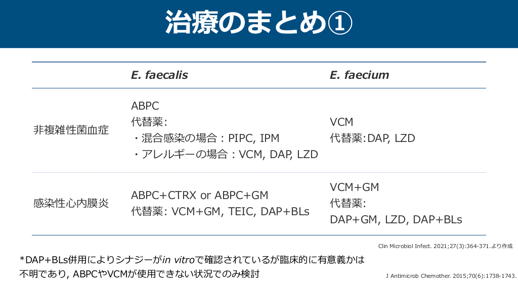 複雑性菌 感染性 症 内膜炎 E. faecalis E. faecium ABPC 代替薬: ・混合感染の場合:PIPC, IPM ・アレルギーの場合:VCM, DAP, LZD VCM 代替薬:DAP, LZD ABPC+CTRX or ABPC+GM 代替薬: VCM+GM, TEIC, DAP+BLs VCM+GM 代替薬: DAP+GM, LZD, DAP+BLs Clin Microbiol Infect. 2021;27(3):364-371.より作成 用 用 血 *DAP+BLs併 によりシナジーがin vitroで確認されているが臨床的に有意義かは 不明であり, ABPCやVCMが使 できない状況でのみ検討 心 非 治療のまとめ① J Antimicrob Chemother. 2015;70(6):1738-1743. #59.