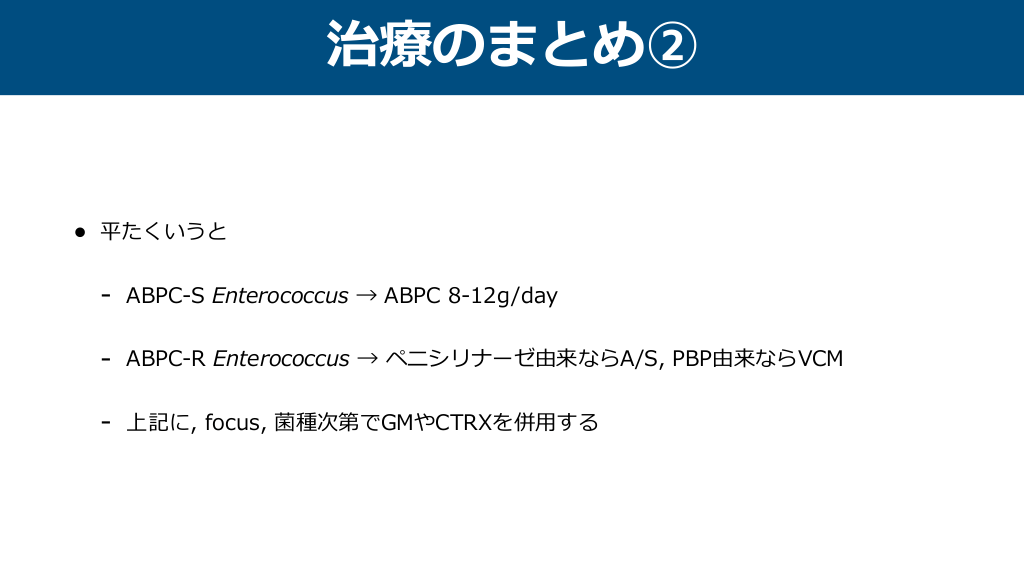 治療のまとめ② 平たくいうと - ABPC-S Enterococcus → ABPC 8-12g/day - ABPC-R Enterococcus → ペニシリナーゼ由来ならA/S, PBP由来ならVCM - 上記に, focus, 菌種次第でGMやCTRXを併 用 • する #60.