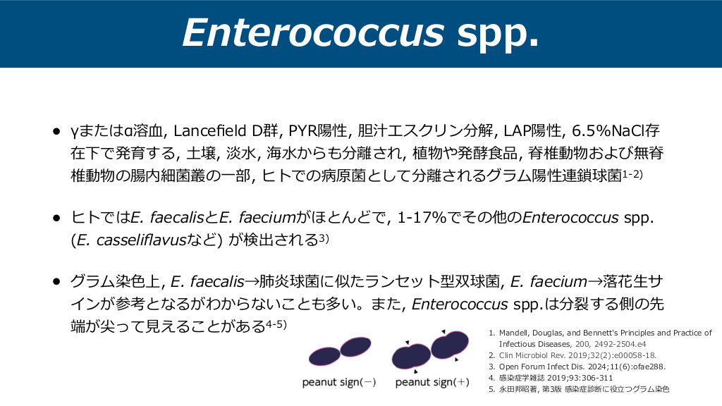 Enterococcus spp. • γまたはα溶 , Lance eld D群, PYR陽性, 胆汁エスクリン分解, LAP陽性, 6.5%NaCl存 在下で発育する, 壌, 淡 , 海 からも分離され, 植物や発酵 品, 脊椎動物および無脊 椎動物の腸内細菌叢の 部, ヒトでの病原菌として分離されるグラム陽性連鎖球菌1-2) • ヒトではE. faecalisとE. faeciumがほとんどで, 1-17%でその他のEnterococcus spp. (E. casseli avusなど) が検出される3) • グラム染 上, E. faecalis→肺炎球菌に似たランセット型双球菌, E. faecium→落花 サ インが参考となるがわからないことも多い。また, Enterococcus spp.は分裂する側の先 端が尖って えることがある4-5) 1. Mandell, Douglas, and Bennett's Principles and Practice of 生 食 水 水 色 一 fi 立 土 血 見 fl 色 田 2. 3. 4. 5. Infectious Diseases, 200, 2492-2504.e4 Clin Microbiol Rev. 2019;32(2):e00058-18. Open Forum Infect Dis. 2024;11(6):ofae288. 感染症学雑誌 2019;93:306-311 永 邦昭著, 第3版 感染症診断に役 つグラム染 腸球菌の分離と感染症のリスク因子 #7.