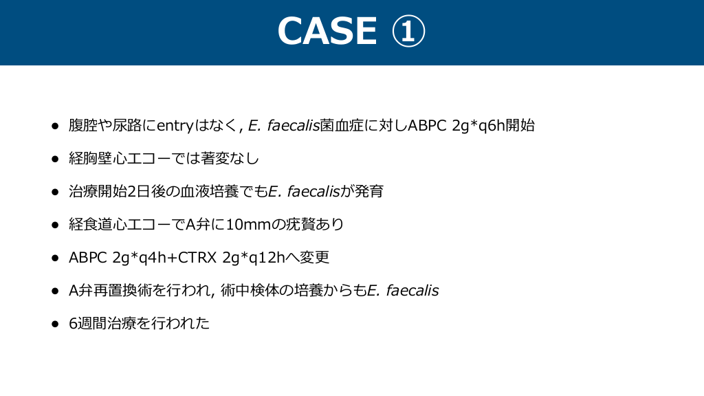 腹腔や尿路にentryはなく, E. faecalis菌 • 経胸壁 • 治療開始2 • 経 • ABPC 2g*q4h+CTRX 2g*q12hへ変更 • A弁再置換術を • 6週間治療を われた 症に対しABPC 2g*q6h開始 エコーでは著変なし 後の 液培養でもE. faecalisが発育 エコーでA弁に10mmの疣贅あり われ, 術中検体の培養からもE. faecalis 血 血 道 行 行 • 日 心 心 食 CASE ① 腸球菌感染症の治療におけるケーススタディ #62.