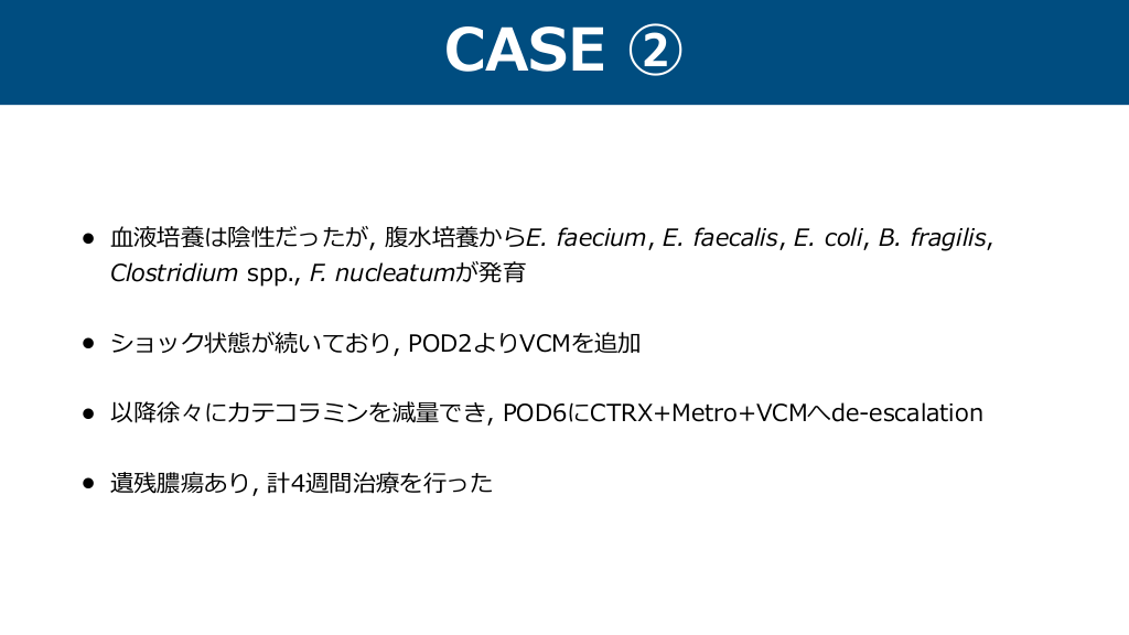 液培養は陰性だったが, 腹 培養からE. faecium, E. faecalis, E. coli, B. fragilis, Clostridium spp., F. nucleatumが発育 • ショック状態が続いており, POD2よりVCMを追加 • 以降徐々にカテコラミンを減量でき, POD6にCTRX+Metro+VCMへde-escalation • 遺残膿瘍あり, 計4週間治療を 行 • 水 血 CASE ② った #63.