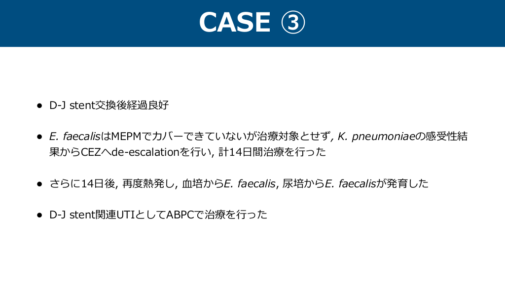CASE ③ D-J stent交換後経過良好 • E. faecalisはMEPMでカバーできていないが治療対象とせず, K. pneumoniaeの感受性結 果からCEZへde-escalationを い, 計14 間治療を った • さらに14 • D-J stent関連UTIとしてABPCで治療を った 行 日 培からE. faecalis, 尿培からE. faecalisが発育した 行 行 後, 再度熱発し, 血 日 •