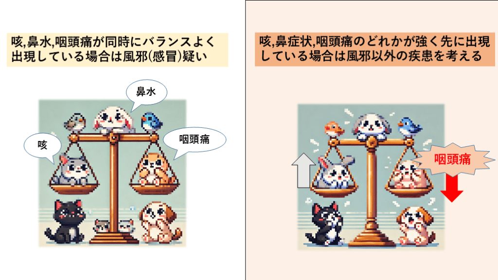 #6. 咳,鼻水,咽頭痛が同時にバランスよく出現している場合は風邪(感冒)疑い 咳,鼻症状,咽頭痛のどれかが強く先に出現している場合は風邪以外の疾患を考える 咽頭痛 鼻水 咽頭痛 咳