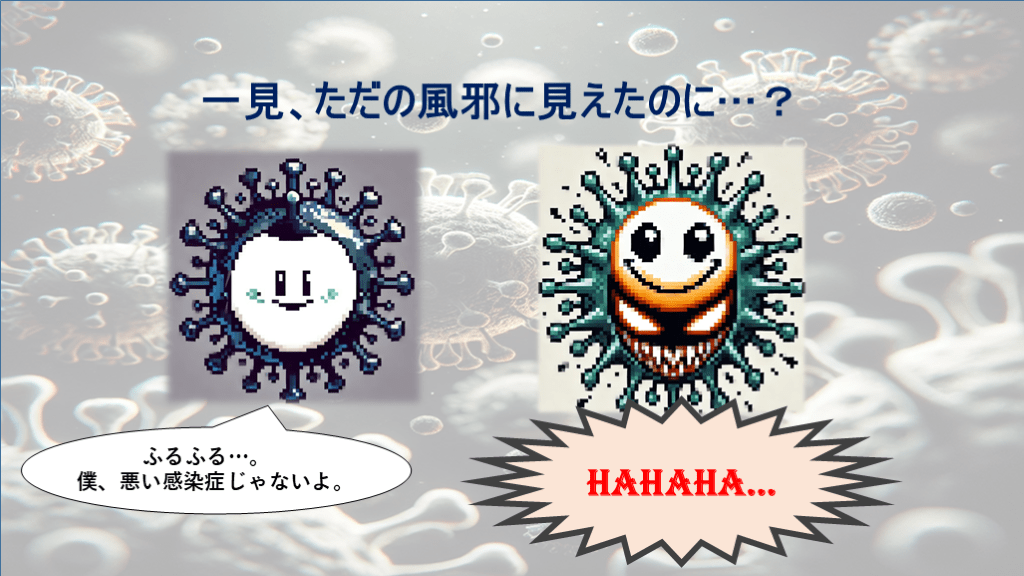 ・風邪(普通感冒): 軽度の上気道症状が中心で自然軽快し重症化はまれ。 ・インフルエンザ/COVID-19: ウイルス感染症ではあるものの、感染力が強く