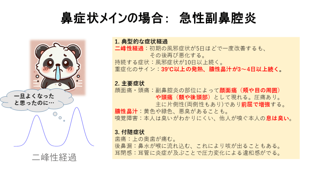 耳閉感:耳管に炎症が及ぶことで圧力変化による違和感がでる。 鼻症状メインの場合: 急性副鼻腔炎 二峰性経過 一旦よくなったと思ったのに…