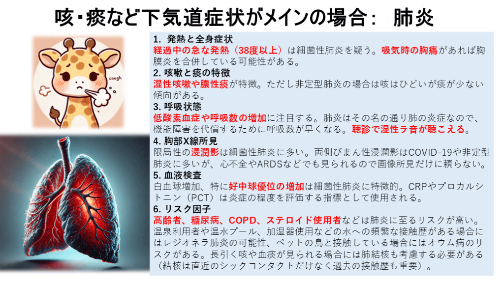 高齢者、糖尿病、COPD、ステロイド使用者などは肺炎に至るリスクが高い。温泉利用者や温水プール、加湿器使用などの水への頻繁な接触歴がある場合にはレジオネラ肺炎の可能性、ペットの鳥と接触している場合にはオウム病のリスクがある。長引く咳や血痰が見られる場合には肺結核も考慮する必要がある(結核は直近のシックコンタクトだけなく過去の接触歴も重要)。 咳・痰など下気道症状がメインの場合: 肺炎