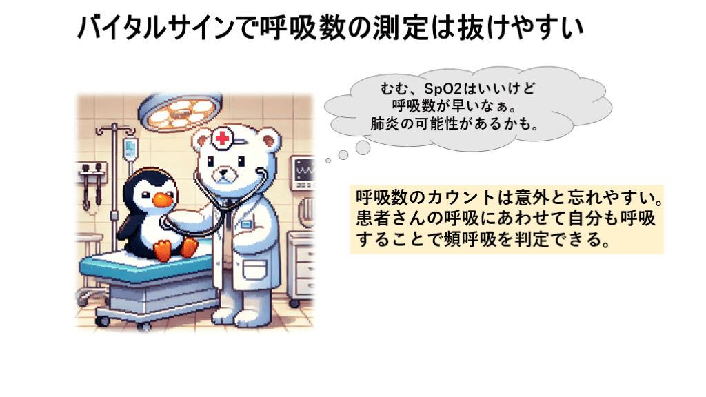 肺炎の可能性があるかも。 バイタルサインで呼吸数の測定は抜けやすい
