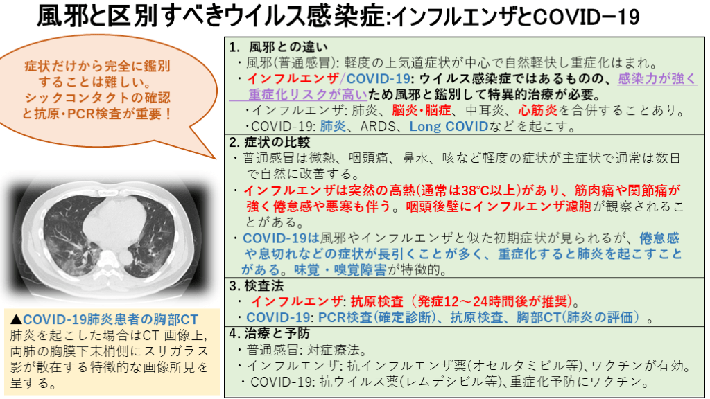 重症化リスクが高いため風邪と鑑別して特異的治療が必要。 ・インフルエンザ: 肺炎、脳炎・脳症、中耳炎、心筋炎を合併することあり。 ・COVID-19: 肺炎、ARDS、Long COVIDなどを起こす。