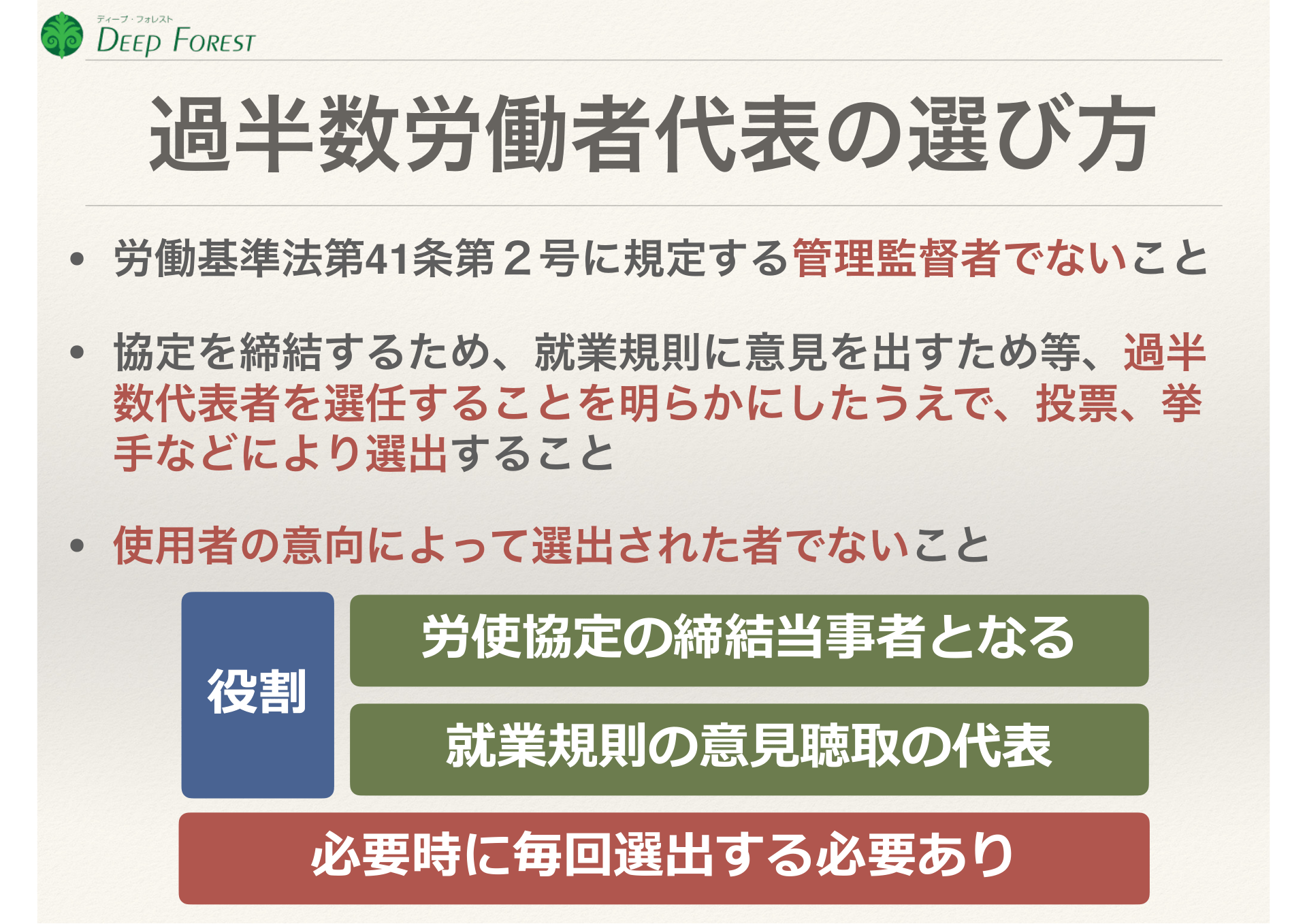 過半数労働者代表の選び方 • 労働基準法第41条第2号に規定する管理監督者でないこと • 協定を締結するため、就業規則に意見を出すため等、過半 数代表者を選任することを明らかにしたうえで、投票、挙 手などにより選出すること • 使用者の意向によって選出された者でないこと 役割 労使協定の締結当事者となる 就業規則の意⾒聴取の代表 必要時に毎回選出する必要あり