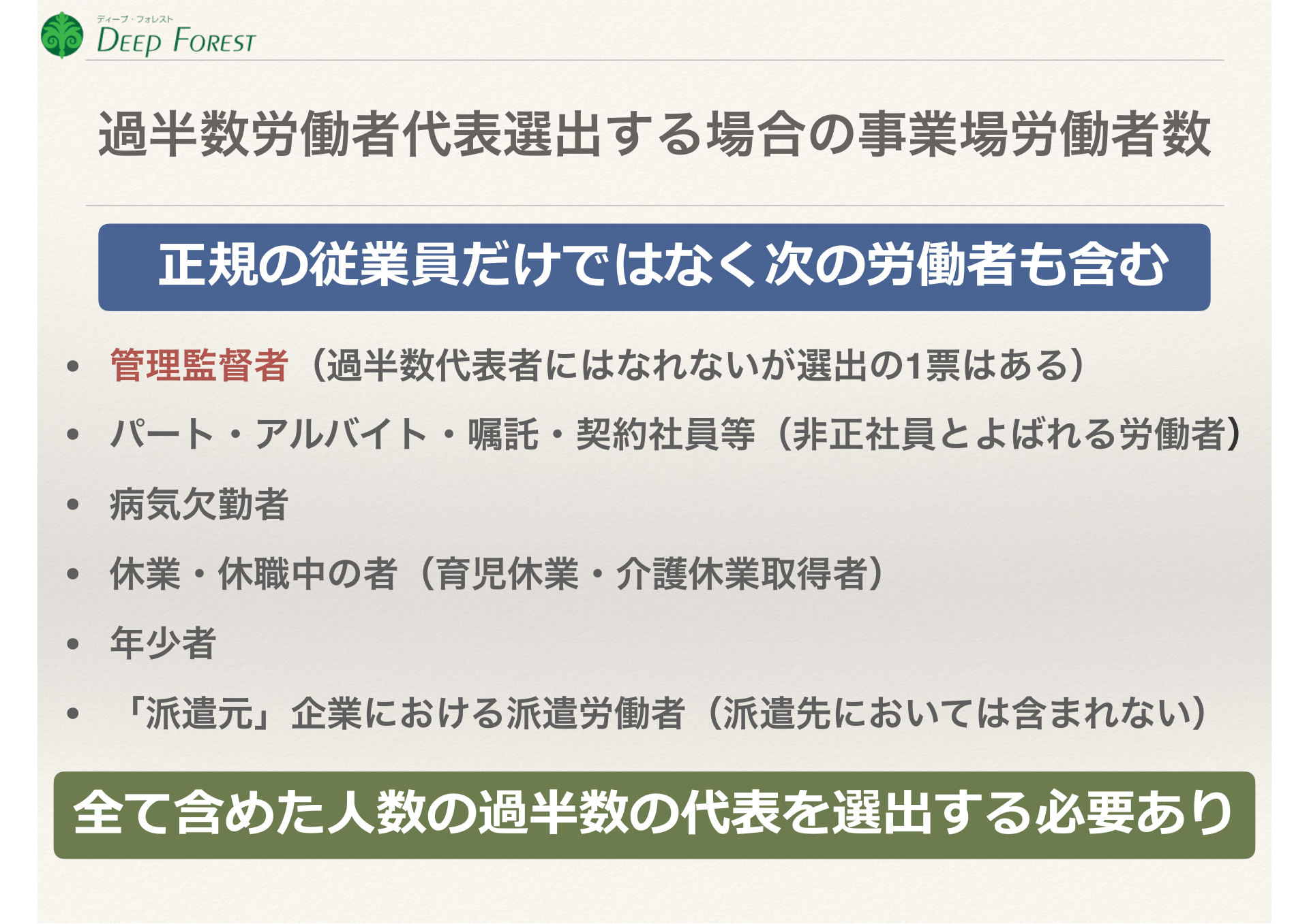 過半数労働者代表選出する場合の事業場労働者数 正規の従業員だけではなく次の労働者も含む • • • • • • 管理監督者(過半数代表者にはなれないが選出の1票はある) パート・アルバイト・嘱託・契約社員等(非正社員とよばれる労働者) 病気欠勤者 休業・休職中の者(育児休業・介護休業取得者) 年少者 「派遣元」企業における派遣労働者(派遣先においては含まれない) 全て含めた⼈数の過半数の代表を選出する必要あり