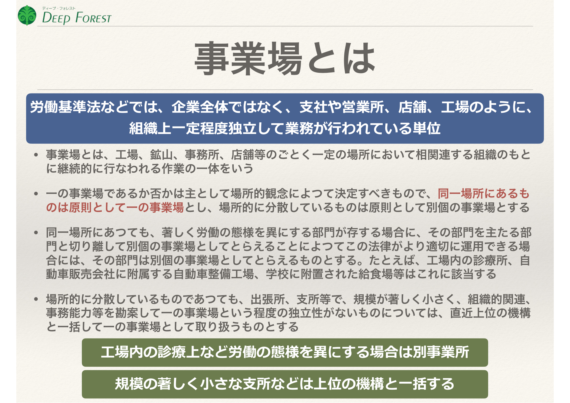 事業場とは 労働基準法などでは、企業全体ではなく、⽀社や営業所、店舗、⼯場のように、 組織上⼀定程度独⽴して業務が⾏われている単位 • 事業場とは、工場、鉱山、事務所、店舗等のごとく一定の場所において相関連する組織のもと に継続的に行なわれる作業の一体をいう • 一の事業場であるか否かは主として場所的観念によつて決定すべきもので、同一場所にあるも のは原則として一の事業場とし、場所的に分散しているものは原則として別個の事業場とする • 同一場所にあつても、著しく労働の態様を異にする部門が存する場合に、その部門を主たる部 門と切り離して別個の事業場としてとらえることによつてこの法律がより適切に運用できる場 合には、その部門は別個の事業場としてとらえるものとする。たとえば、工場内の診療所、自 動車販売会社に附属する自動車整備工場、学校に附置された給食場等はこれに該当する • 場所的に分散しているものであつても、出張所、支所等で、規模が著しく小さく、組織的関連、 事務能力等を勘案して一の事業場という程度の独立性がないものについては、直近上位の機構 と一括して一の事業場として取り扱うものとする ⼯場内の診療上など労働の態様を異にする場合は別事業所 規模の著しく⼩さな⽀所などは上位の機構と⼀括する