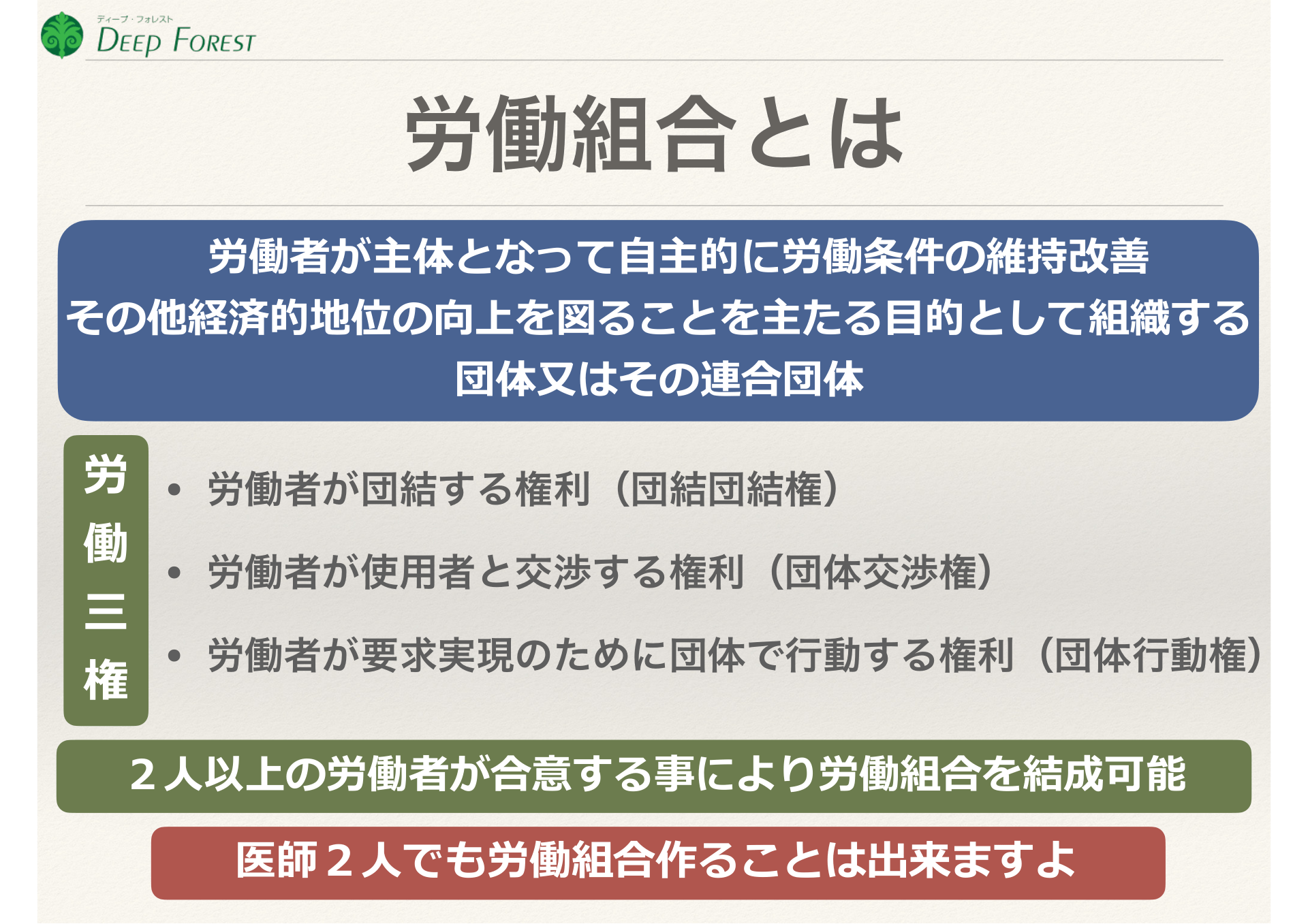 労働組合とは 労働者が主体となって⾃主的に労働条件の維持改善 その他経済的地位の向上を図ることを主たる⽬的として組織する 団体⼜はその連合団体 労 働 • • 三 • 権 労働者が団結する権利(団結団結権) 労働者が使用者と交渉する権利(団体交渉権) 労働者が要求実現のために団体で行動する権利(団体行動権) 2⼈以上の労働者が合意する事により労働組合を結成可能 医師2⼈でも労働組合作ることは出来ますよ