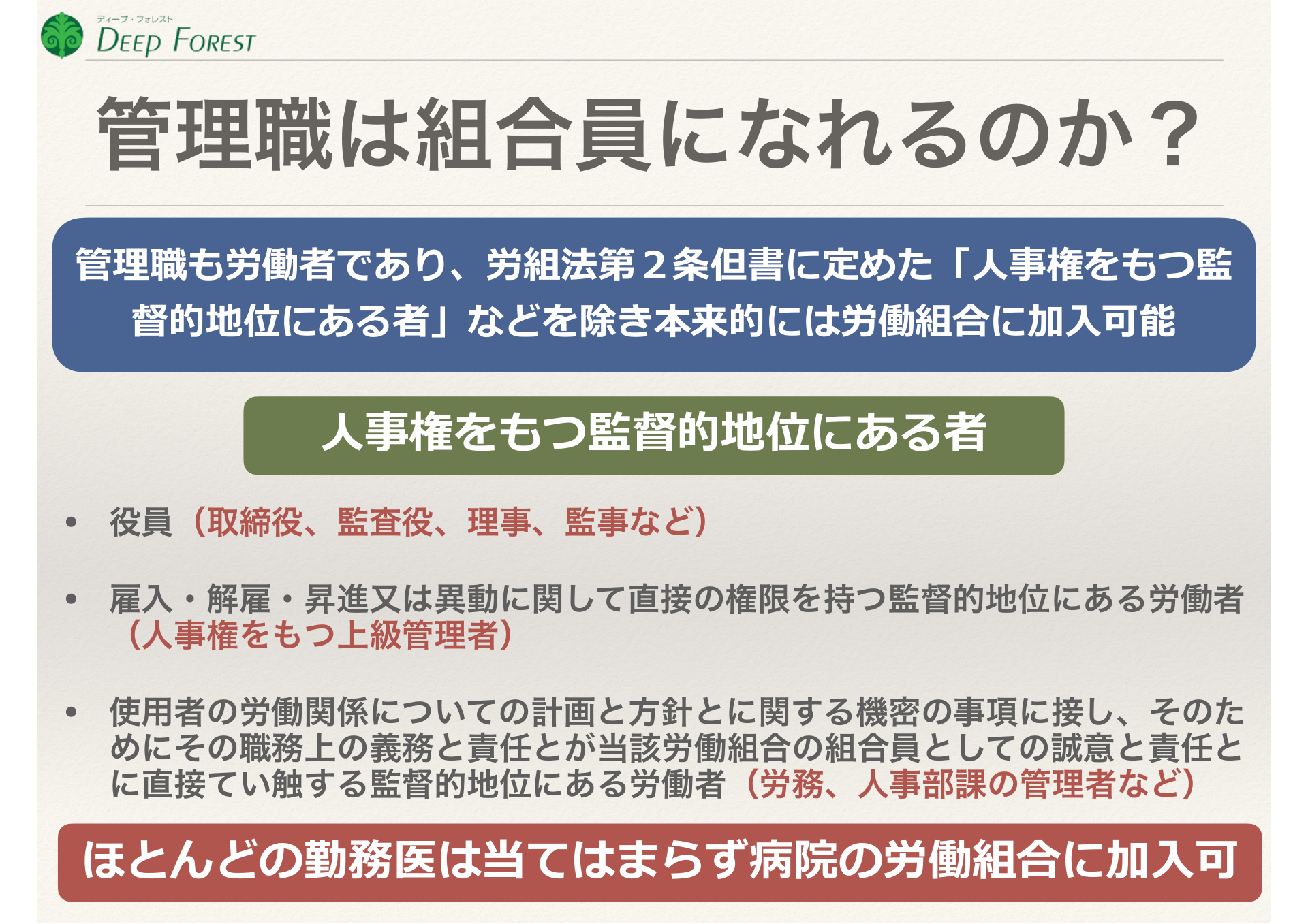 管理職は組合員になれるのか? 管理職も労働者であり、労組法第2条但書に定めた「⼈事権をもつ監 督的地位にある者」などを除き本来的には労働組合に加⼊可能 ⼈事権をもつ監督的地位にある者 • 役員(取締役、監査役、理事、監事など) • 雇入・解雇・昇進又は異動に関して直接の権限を持つ監督的地位にある労働者 (人事権をもつ上級管理者) • 使用者の労働関係についての計画と方針とに関する機密の事項に接し、そのた めにその職務上の義務と責任とが当該労働組合の組合員としての誠意と責任と に直接てい触する監督的地位にある労働者(労務、人事部課の管理者など) ほとんどの勤務医は当てはまらず病院の労働組合に加⼊可