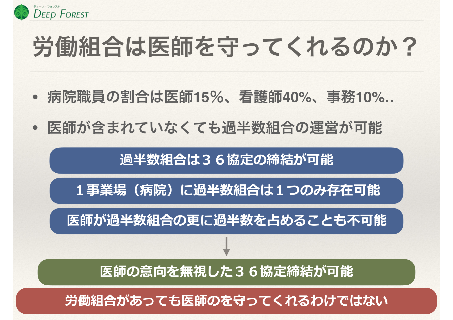労働組合は医師を守ってくれるのか? • • 病院職員の割合は医師15%、看護師40%、事務10%‥ 医師が含まれていなくても過半数組合の運営が可能 過半数組合は36協定の締結が可能 1事業場(病院)に過半数組合は1つのみ存在可能 医師が過半数組合の更に過半数を占めることも不可能 医師の意向を無視した36協定締結が可能 労働組合があっても医師のを守ってくれるわけではない