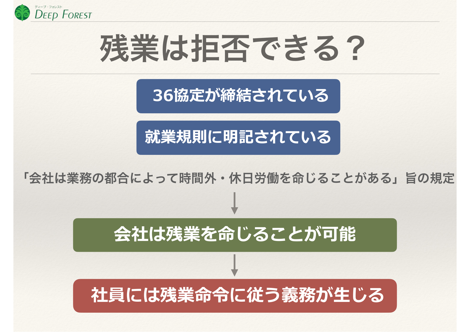 残業は拒否できる? 36協定が締結されている 就業規則に明記されている 「会社は業務の都合によって時間外・休日労働を命じることがある」旨の規定 会社は残業を命じることが可能 社員には残業命令に従う義務が⽣じる