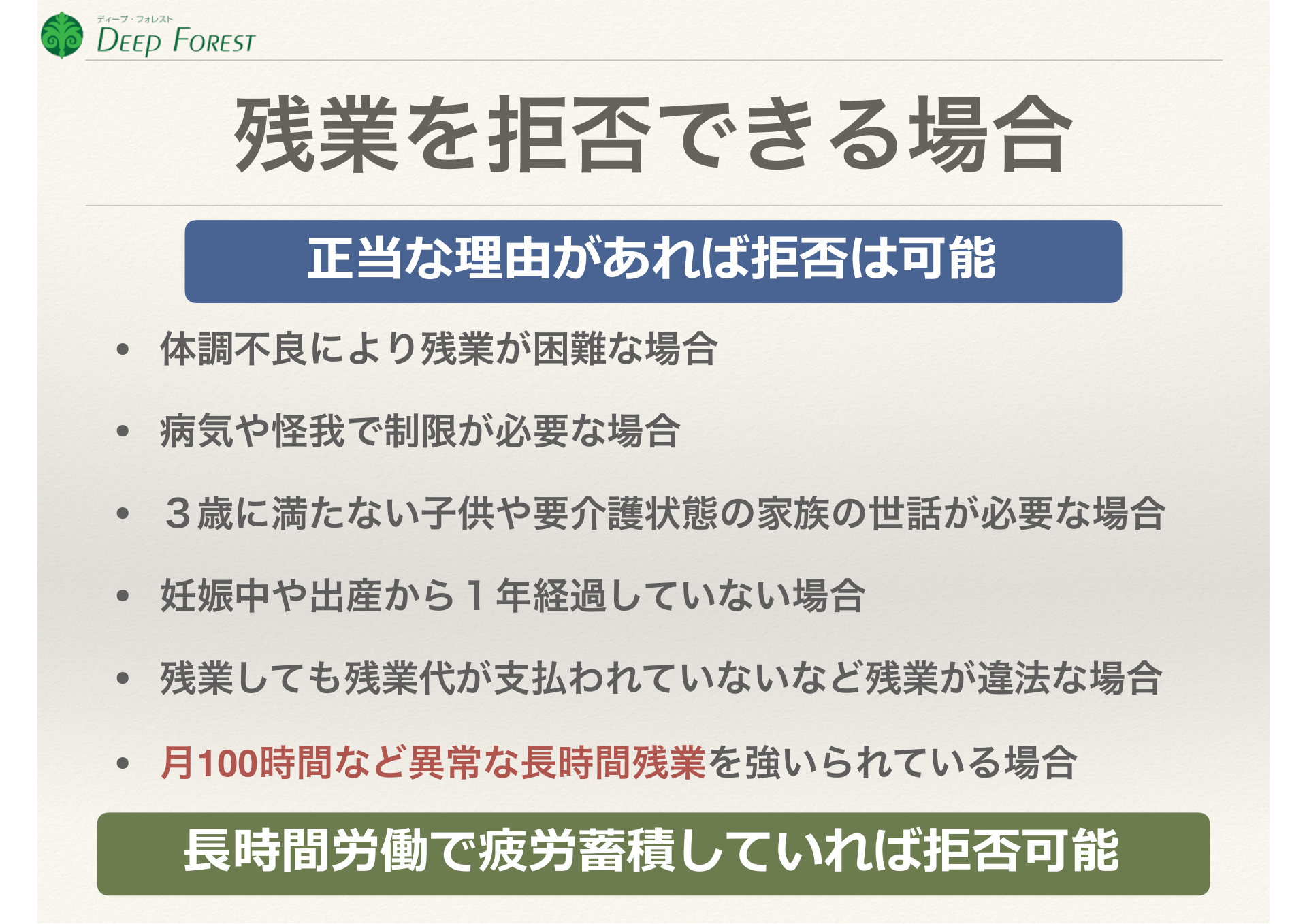 残業を拒否できる場合 正当な理由があれば拒否は可能 • 体調不良により残業が困難な場合 • 病気や怪我で制限が必要な場合 • 3歳に満たない子供や要介護状態の家族の世話が必要な場合 • 妊娠中や出産から1年経過していない場合 • 残業しても残業代が支払われていないなど残業が違法な場合 • 月100時間など異常な長時間残業を強いられている場合 ⻑時間労働で疲労蓄積していれば拒否可能