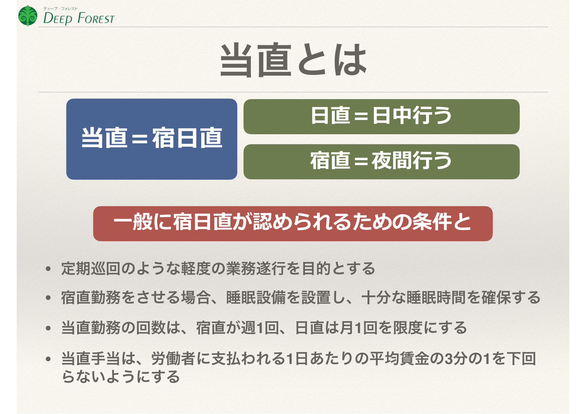 当直とは 当直=宿⽇直 ⽇直=⽇中⾏う 宿直=夜間⾏う ⼀般に宿⽇直が認められるための条件と • • • • 定期巡回のような軽度の業務遂行を目的とする 宿直勤務をさせる場合、睡眠設備を設置し、十分な睡眠時間を確保する 当直勤務の回数は、宿直が週1回、日直は月1回を限度にする 当直手当は、労働者に支払われる1日あたりの平均賃金の3分の1を下回 らないようにする
