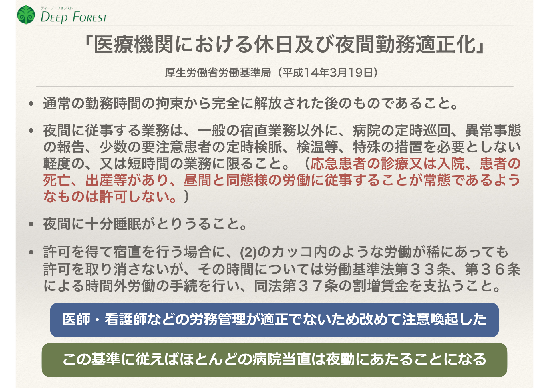 「医療機関における休日及び夜間勤務適正化」 厚生労働省労働基準局(平成14年3月19日) • • 通常の勤務時間の拘束から完全に解放された後のものであること。 • • 夜間に十分睡眠がとりうること。 夜間に従事する業務は、一般の宿直業務以外に、病院の定時巡回、異常事態 の報告、少数の要注意患者の定時検脈、検温等、特殊の措置を必要としない 軽度の、又は短時間の業務に限ること。(応急患者の診療又は入院、患者の 死亡、出産等があり、昼間と同態様の労働に従事することが常態であるよう なものは許可しない。) 許可を得て宿直を行う場合に、(2)のカッコ内のような労働が稀にあっても 許可を取り消さないが、その時間については労働基準法第33条、第36条 による時間外労働の手続を行い、同法第37条の割増賃金を支払うこと。 医師・看護師などの労務管理が適正でないため改めて注意喚起した この基準に従えばほとんどの病院当直は夜勤にあたることになる