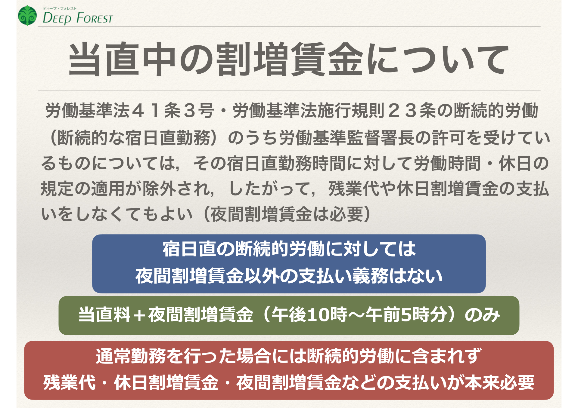 当直中の割増賃金について 労働基準法41条3号・労働基準法施行規則23条の断続的労働 (断続的な宿日直勤務)のうち労働基準監督署長の許可を受けてい るものについては,その宿日直勤務時間に対して労働時間・休日の 規定の適用が除外され,したがって,残業代や休日割増賃金の支払 いをしなくてもよい(夜間割増賃金は必要) 宿⽇直の断続的労働に対しては 夜間割増賃⾦以外の⽀払い義務はない 当直料+夜間割増賃⾦(午後10時〜午前5時分)のみ 通常勤務を⾏った場合には断続的労働に含まれず 残業代・休⽇割増賃⾦・夜間割増賃⾦などの⽀払いが本来必要