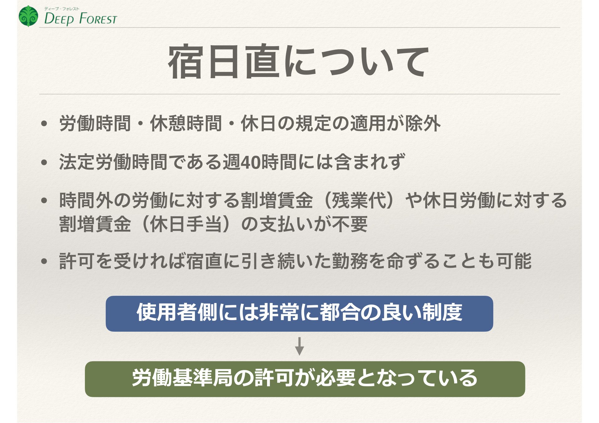 宿日直について • • • 労働時間・休憩時間・休日の規定の適用が除外 • 許可を受ければ宿直に引き続いた勤務を命ずることも可能 法定労働時間である週40時間には含まれず 時間外の労働に対する割増賃金(残業代)や休日労働に対する 割増賃金(休日手当)の支払いが不要 使⽤者側には⾮常に都合の良い制度 労働基準局の許可が必要となっている